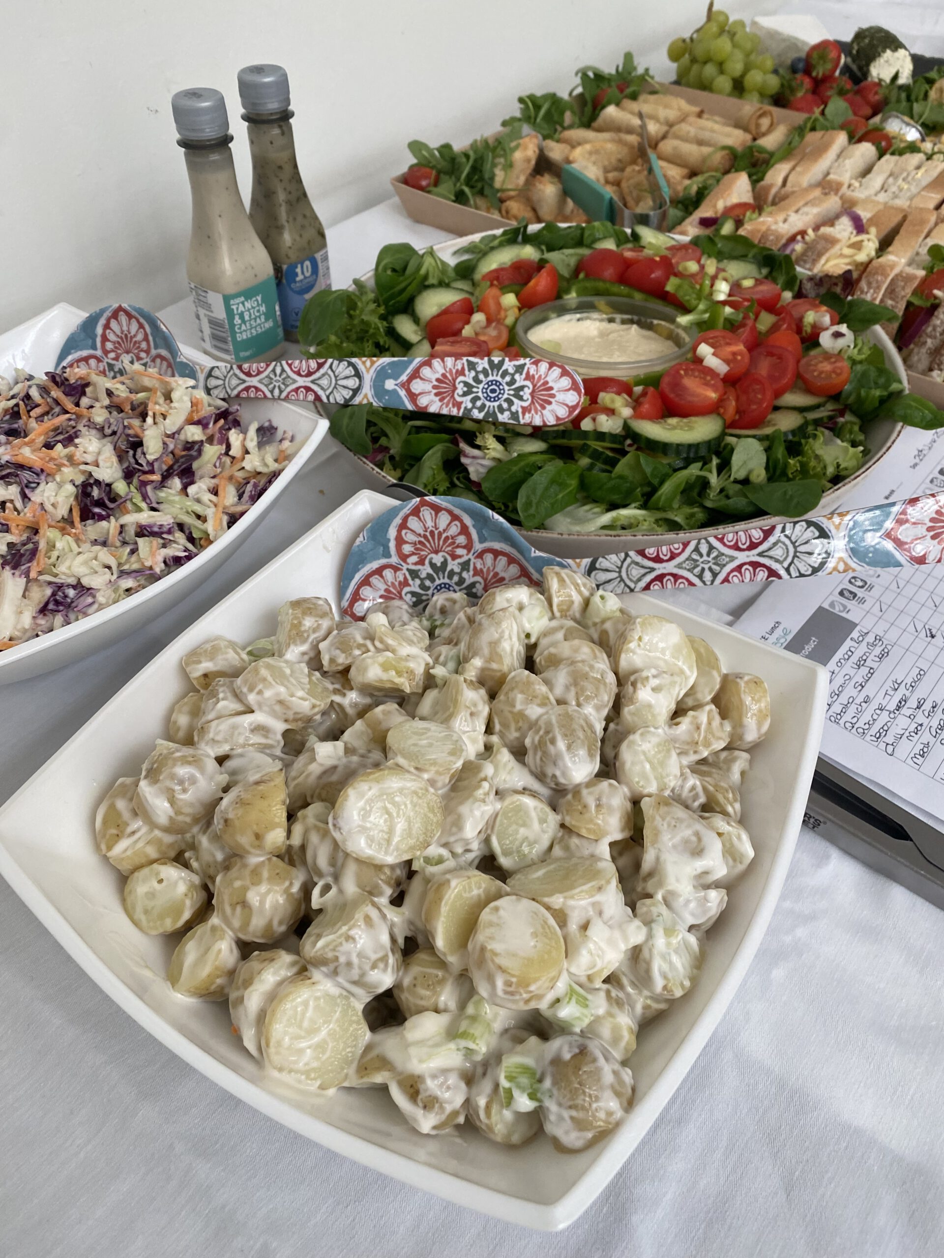 Leafy salad coleslaw potato salad with spring onion and/or pancetta Various cheeses with fruits